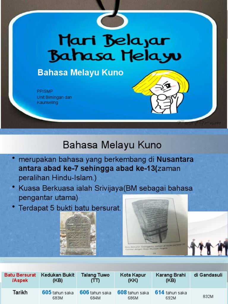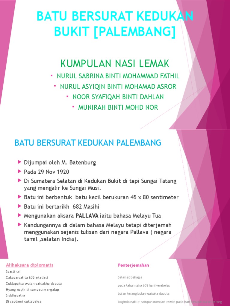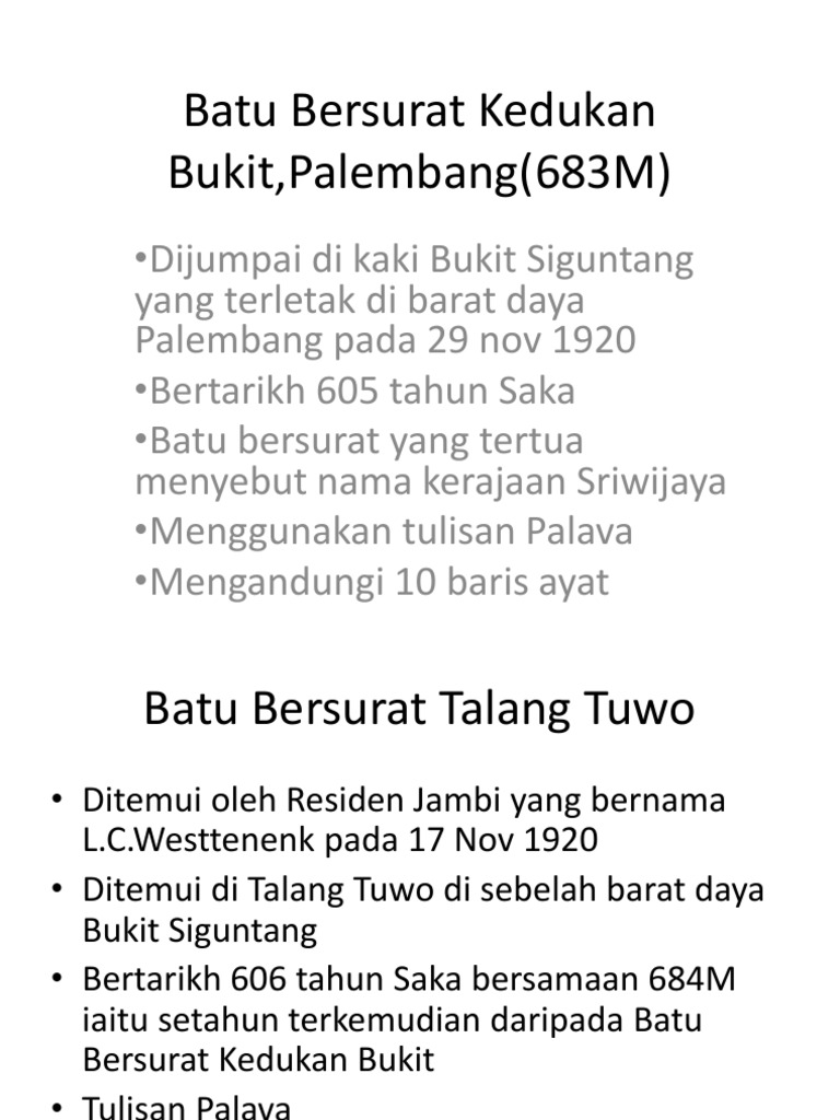 De casparis, ''indonesian paleography'', 1975 * emeis,m.g., 1975, ''bunga rampai melayu kuno''. Bukti berdirinya kerajaan sriwijaya, di tandai oleh sebuah prasasti kedukan bukit yang di temukan di daerah kedukan bukit Start studying bm kuno (batu bersurat). Sebuah batu bersurat tulisan pallava telah ditemui di kawasan kedukan bukit, palembang oleh seorang belanda bernama m. Prasasti kedukan bukit atau batu bersurat kedukan bukit dijumpai oleh m.