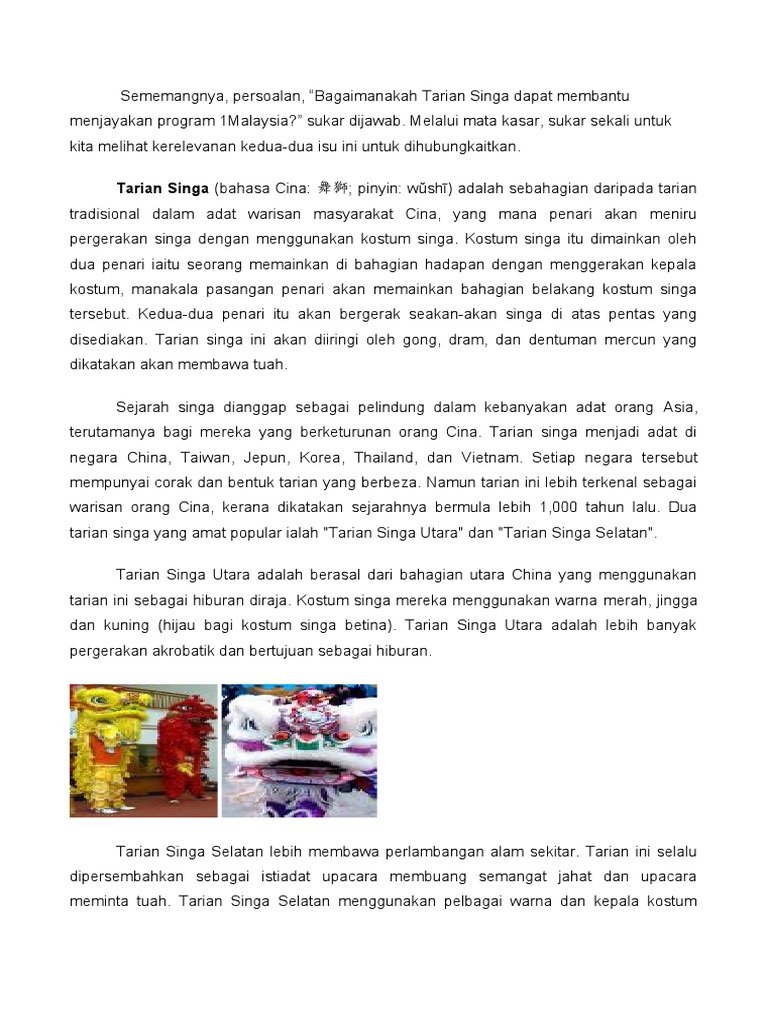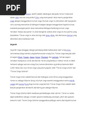 Oleh sebab itu, tarian singa diadakan pada berbagai acara penting. Tahun baru cina, chap goh mei, pesta kuih bulan. Tarian ini bernama tarian tiga warna. Asal usul tari serampang dua belas tari serampang duabelas merupakan kesenian tari tradisional yang berasal dari melayu. Banyak pergerakan akrobatik dan bertujuan sebagai hiburan.