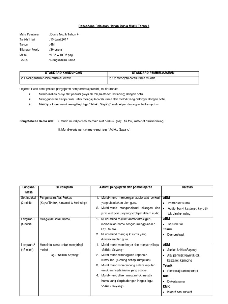 Audio 35 36 37 instrumental ensembel bunga gergasi dengan alat pekusi 1 2 tahun 4. Share rph dunia muzik download melalui youtube menyebabkan virus yang boleh menjejaskan prestasi komputer anda. Share & embed rph muzik tahun 4.docx. Rph kssr dunia muzik tahun 4. Saya telah design rancangan pengajaran harian bagi mata pelajaran kssr dunia muzik dalam bentuk microsoft excel.