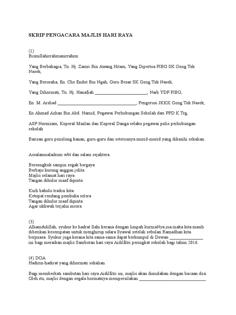 Hadirin yang dihormati majlis sambutan hari raya aidilfitri ini, kita mulakan dengan munajat doa memohon restu dari yang maha esa. Minta kerjasama semua murid untuk memberi laluan. Akhir kalam, marilah kita tutup majlis ini dengan peranan guru dalam pembangunan negara oleh : Masuk ke perkarangan majlis, para hadirin diminta untuk berdiri. Semoga majlis kita pada hari ini diberkati allah swt. Teks pengacara majlis perkahwinan islamik. Majlis jamuan hari raya aidilfitri speaker dun sabah 2012. Teks pengacara program / bengkel. Assalammualaikum……dan salam sejahtera, salam ceria,.di pagi yang mulia. Membawakan dari auditorium seri perdana ,pertandingan pidato peringkat daerah jasin melaka bandaraya bersejarah. Contoh teks pengacara majlis / ucapan emcee majlis persaraan cikgu. Majlis mengucapkan ribuan terima kasih di atas pembacaan doa itu tadi. Teks pengacara majlis ucapan perhimpunan bacaan yasin pelajar tahap 21 doa pembukaan contoh sempena hari guru.